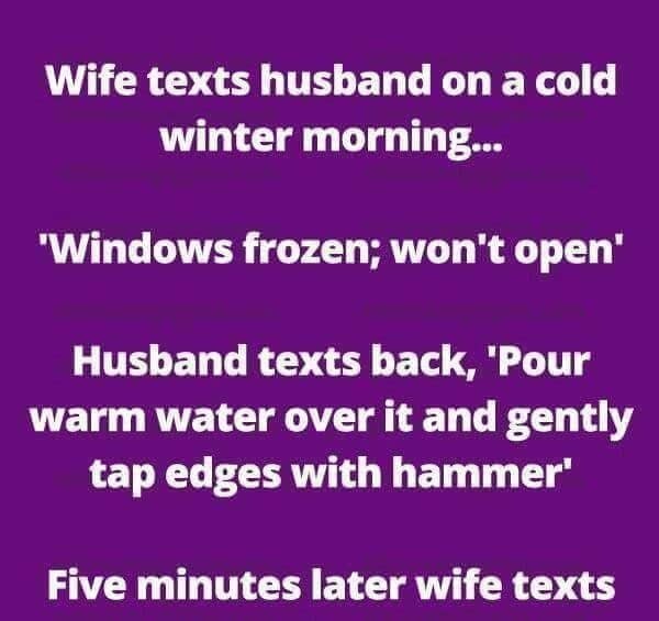 “Frozen Windows: A Hilarious Misunderstanding” Posted on December 16, 2024 By Gaga sardi No Comments on “Frozen Windows: A Hilarious Misunderstanding” Wife texts husband on a cold winter morning… “Windows frozen; won’t open.” Husband texts back, “Pour warm water over it and gently tap edges with hammer.” Five minutes later wife texts back, “Computer really messed up now.” Bitly code “Frozen Windows: A Hilarious Misunderstanding” 📋 Uncategorized