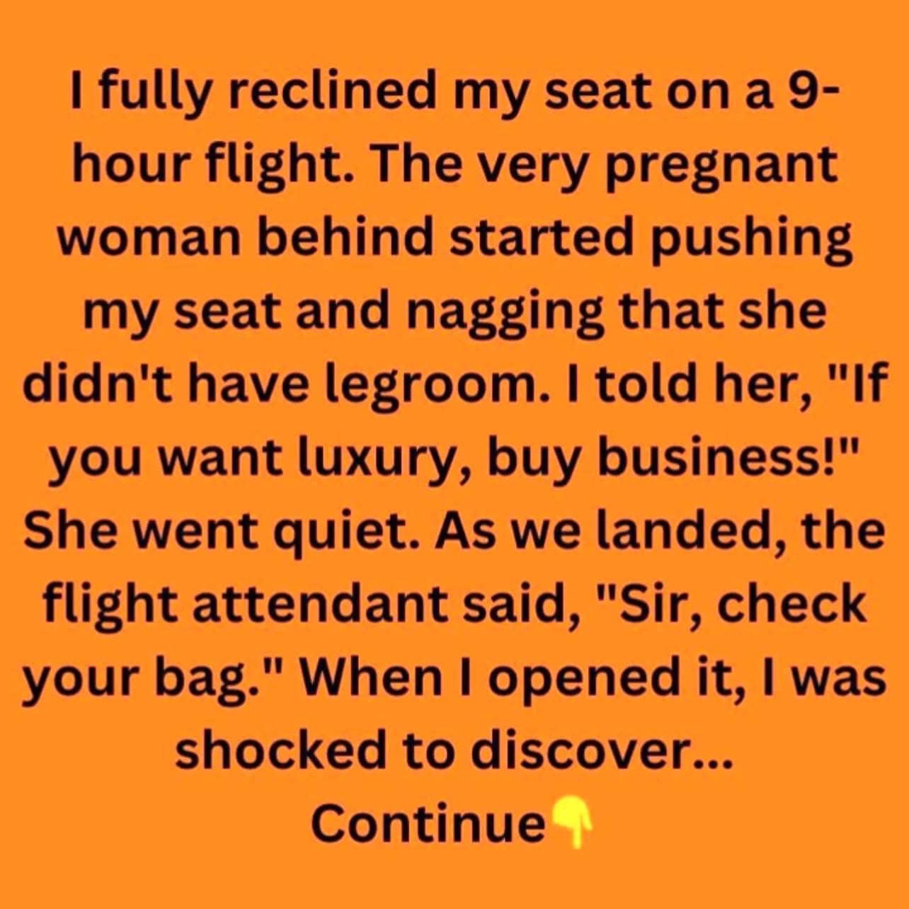 I fully reclined my seat on a 9-hour flight. The very pregnant woman behind me started pushing my seat and nagging that she didn’t have enough legroom. I told her, “If you want luxury, buy business!” She went quiet, and some time later, I realized she wasn’t there anymore.