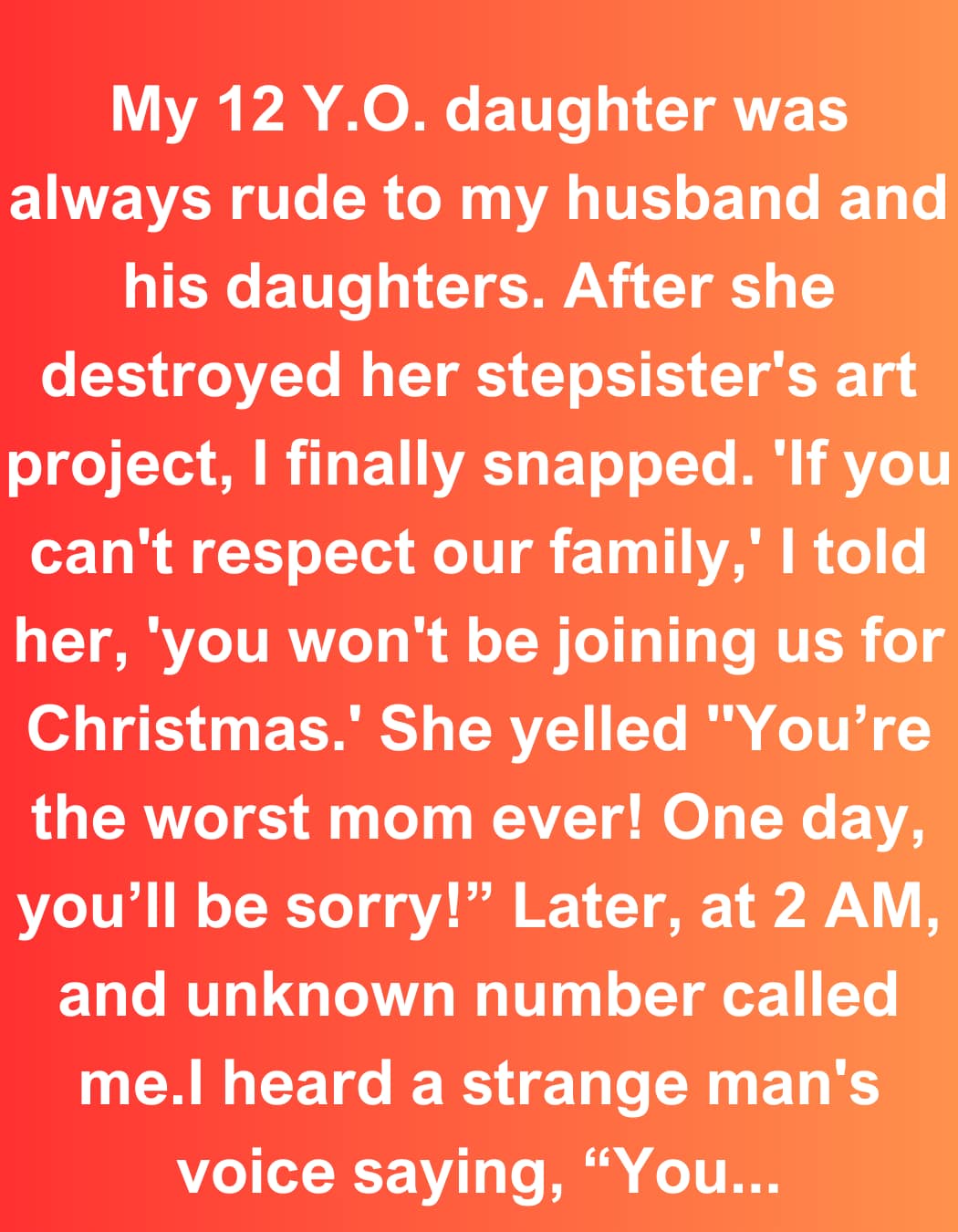 Her words stung, and I finally snapped, “If you can’t respect our family, you won’t be joining us for Christmas.’ When she heard that she couldn’t come for Christmas this year, that’s when things blew up.