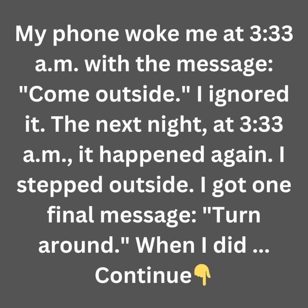 Curious, I decided to play along. At 3:33 a.m., when the alarm buzzed again. Terrified but curious, I stepped outside.