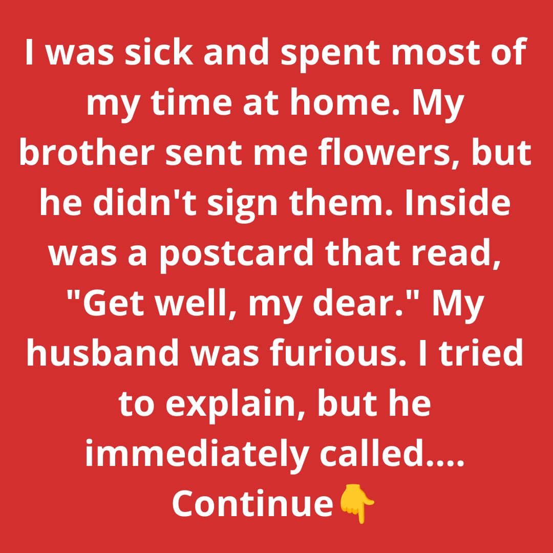 I was sick and spent most of my time at home. My brother sent me flowers, but he didn’t sign them. Inside was a postcard that read, “Get well, my dear.” My husband was furious. I tried to explain, but he immediately called the flower shop and asked who had sent the flowers.
