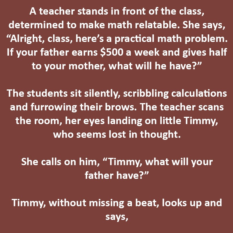 She says, “Alright, class, here’s a practical math problem. If your father earns $500 a week and gives half to your mother, what will he have?”