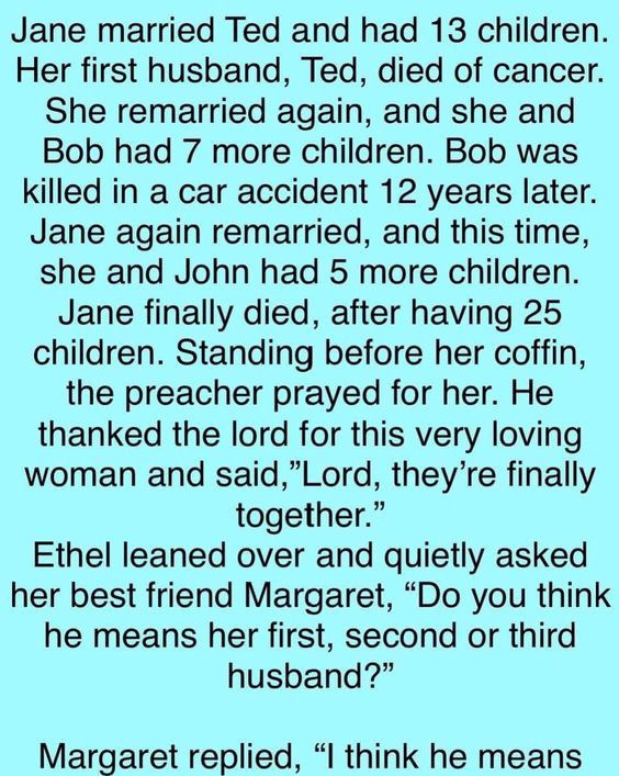 Ethel leaned over and quietly asked her best friend Margaret, ‘Do you think he means her first, second, or third husband?’