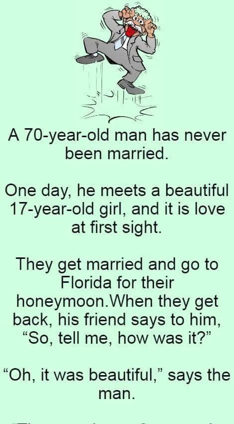 They get married and go to Florida for their honeymoon When they get back, tel frie, howvas him, “Oh, it was beautiful,” says the man. “