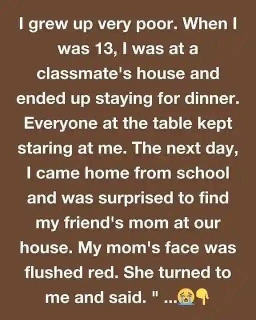 I grew up very poor. When I was 13, I was at a classmate’s house and ended up staying for dinner. My mouth watered at the sight of the golden roast on the table. As everyone began to eat, I took a bite, but her mom’s sharp gaze made me freeze. In front of everyone, she declared, “Did you seriously take that little? That’s not nearly enough!”