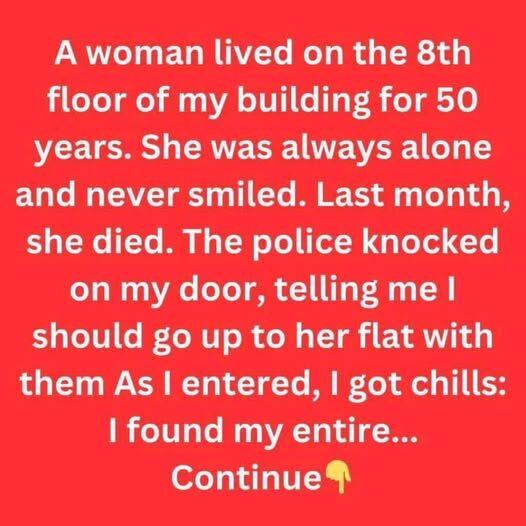 This woman had lived on the 8th floor of my building for 50 years. She was always alone, and never smiled. All the neighbors avoided her because she could start a fight at any moment. Last month, she died. The police knocked on my door, telling me I should go up to her flat with them.