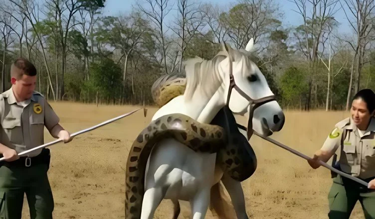 .Approaching cautiously, Joaquim saw a nightmare: Esperança, a young mare, ensnared by a massive green anaconda. The snake had struck from the river, coiling around her neck, torso, and legs. Joaquim screamed for help and charged forward with only a stick and raw determination. Anacondas kill by constriction, not venom — every second mattered. Neighbors soon arrived with machetes and ropes. Killing the snake wasn’t an option; it was protected. They had to separate beast from horse — without shedding blood.