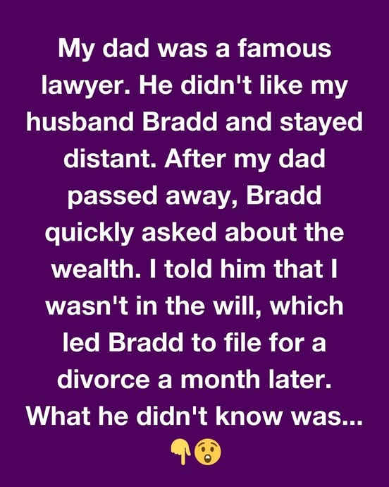 At the dinner, Sarah’s father’s partner revealed her father’s will to Bradd. It contained a stipulation indicating that if Bradd remained married to Sarah for five years after her father passed away, he would be entitled to half of the inheritance, while Sarah would receive the other half. However, in the case of a divorce, Sarah was named as the only beneficiary of her father’s entire fortune and assets.