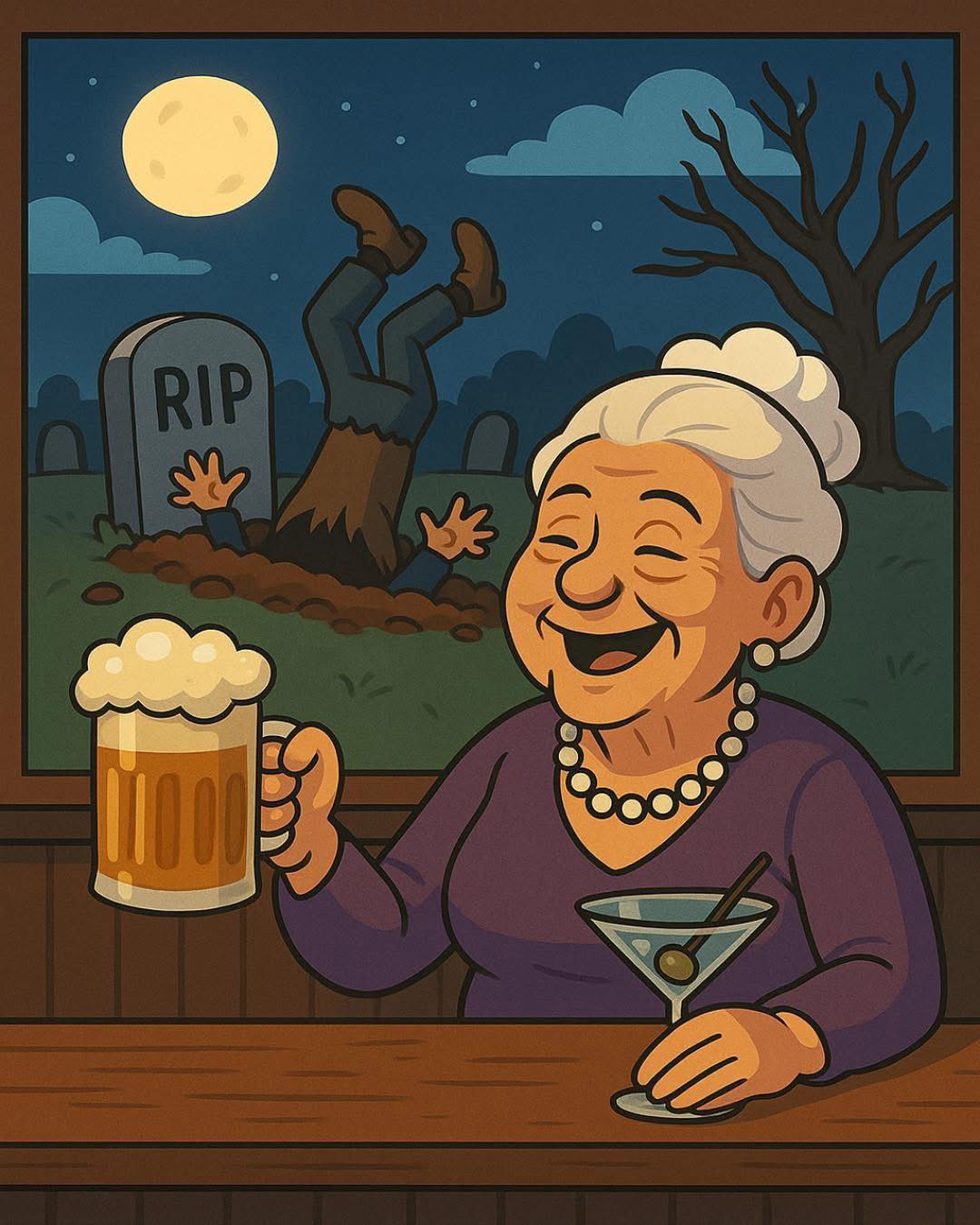 The wife put down her drink and said…”Let the old bastard dig. I had him buried upside down.”