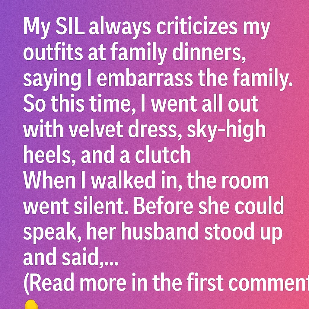My sister-in-law always had something to say about my outfits at family dinners.“They embarrass the family,” she would whisper just loud enough for me to hear.At first, her words stung. I started second-guessing what I wore, even when I loved it. But one day I realized: confidence speaks louder than criticism. So for the next…