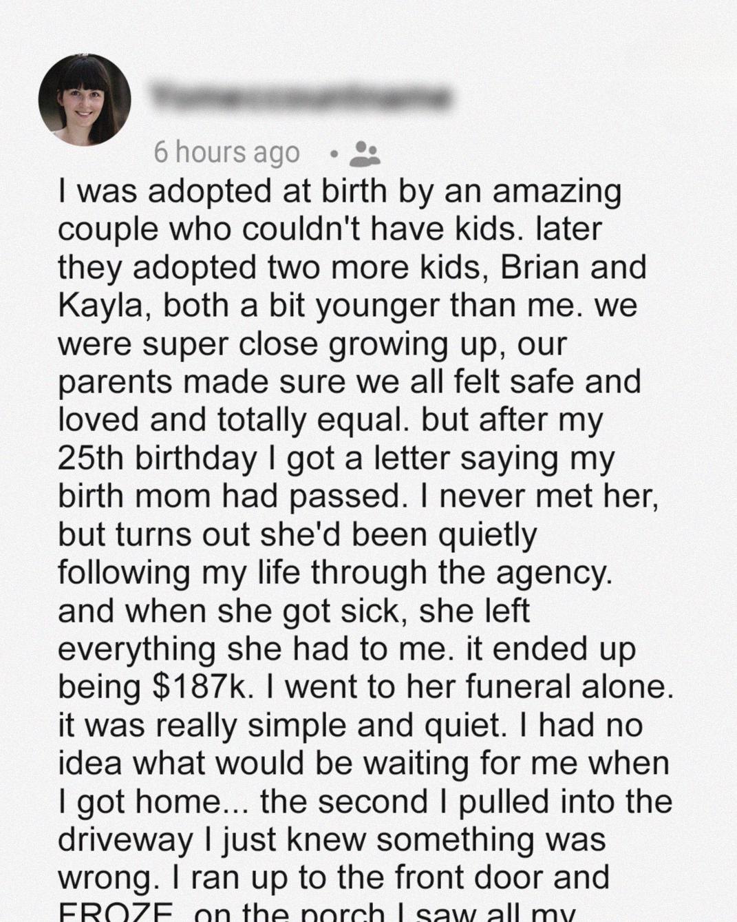 Taylor always believed she had the perfect family. Adopted as a baby, she grew up surrounded by love, sharing laughter, school milestones, and family traditions with her two adopted siblings. They were a team, equal in every way—or so she thought. That belief came crashing down on her 25th birthday, when an unexpected letter arrived. Her birth mother, a woman she had never met, had passed away and left Taylor an inheritance of $187,000. What should have been a bittersweet gift of connection to her past instead became the spark that exposed painful truths within her family.