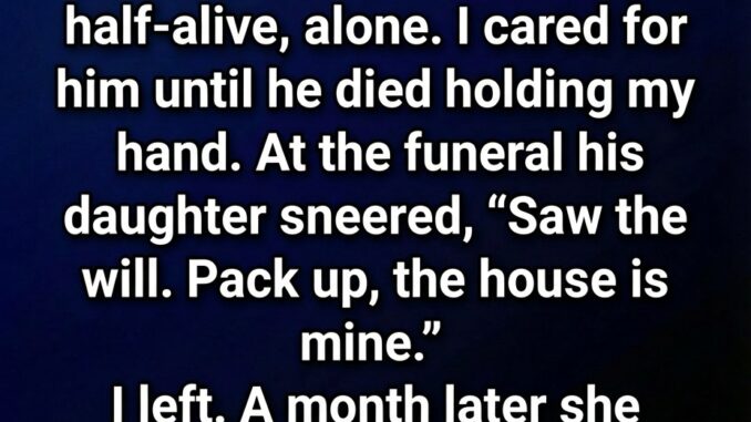 As time passed, his condition worsened, and I stayed by his side until the very end. When he passed away, he was calm, holding my hand, grateful simply not to be alone. The days that followed were heavy with grief, but also with quiet pride that I had shown up when it mattered. At the funeral, his daughter appeared for the first time in months. Her words were sharp and dismissive, focused not on loss but on possessions. She spoke confidently about inheritance, assuming everything had already been decided. I said nothing. Grief had taught me that some arguments are not worth having, and I left shortly after, choosing peace over conflict.