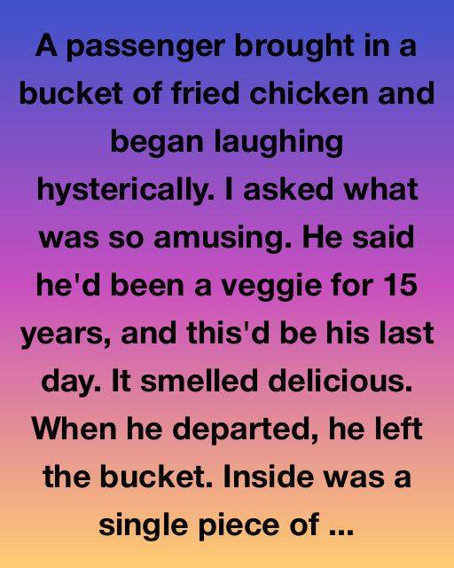 A passenger brought in a bucket of fried chicken and began laughing hysterically. I asked what was so amusing. He said he’d been a veggie for 15…