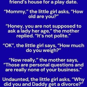 A mother is driving her little girl to her friend’s house for a play date. “Mommy,” the little girl asks, “how old are you?” “Honey, you are…