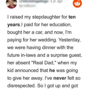 A stepfather shared a heart-wrenching story on Reddit about his disappointment when his stepdaughter chose her biological father to walk her down the aisle after he generously…