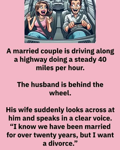 A married couple is driving along a highway doing a steady 40 miles per hour. The husband is behind the wheel. His wife suddenly looks across at…